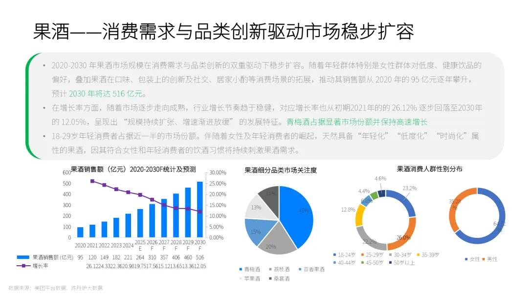 行业历经探索期、品牌化起步期,现已进入全产业链竞争的发展期。RIO、梅见等头部品牌通过产品矩阵优化、产业链布局构建壁垒,渠道端呈现全域化特征,餐饮(35.6%)、便利店(31.1%)、即时零售成为核心通路。消费人群以 18-35 岁年轻群体为主,女性用户占比显著提升,果酒消费者中女性达 64.72%。
