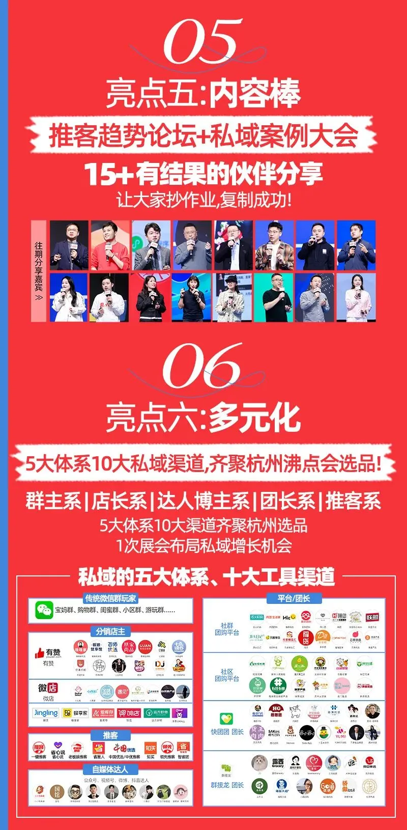 2. 社群私域趋势论坛:邀请有实战成果的品牌方分享实操经验,同时让渠道团长上台讲解选品要求与合作形式,帮助供货商快速了解行业趋势、复制成功经验,精准匹配渠道需求。