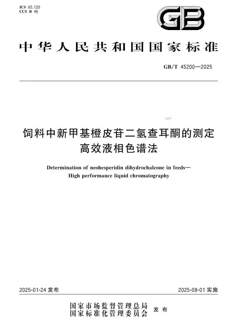 1月24日,由大帝汉克参与起草的国家标准《饲料中新甲基橙皮苷二氢查耳酮的测定高效液相色谱法》(GB/T45200-2025)正式发布,8月1日起实施。该标准规定了配合饲料、浓缩饲料、精料补充料及复合预混合饲料中新甲基橙皮苷二氢查耳酮的检测方法,检出限分别为0.5mg/kg(配合饲料等)和2.5mg/kg(复合预混合饲料)。