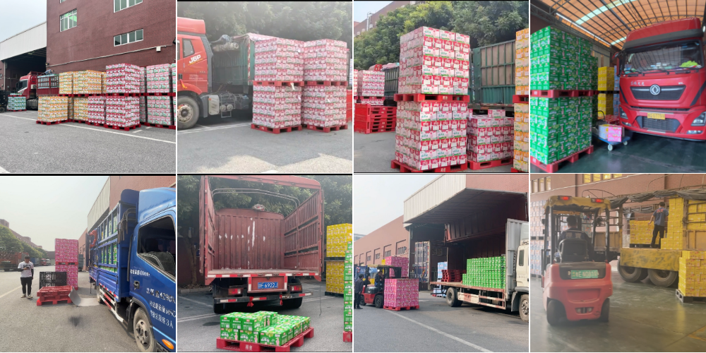 随着禅宝大果粒果汁系列产品在终端市场越来越火爆,各地经销商车队排长龙抢货,仓库叉车和搬运忙到热火朝天,生产加班加点,仓库成品堆积如山。