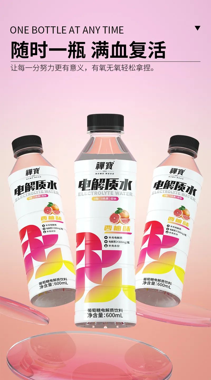 补水充电,就喝禅宝电解质水!禅宝电解质水,含有多种营养元素,电解质含量≥300mg/瓶,0脂、0色素、低钠,不仅补充人体新陈代谢的消耗,调节体内电解质平衡,而且对于办公久坐、运动健身者饮用友好,提供持久能量补充。