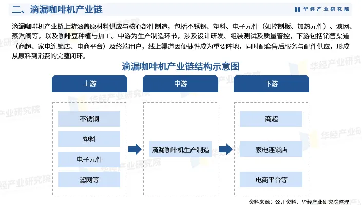 滴漏咖啡机产业链上游涵盖原材料供应与核心部件制造,包括不锈钢、塑料、电子元件(如控制板、加热元件)、滤网、蒸汽阀等,以及咖啡豆种植与加工。中游为生产制造环节,涉及设计研发、组装测试及质量管控,下游包括销售渠道(商超、家电连锁店、电商平台)及终端用户,线上渠道因便捷性成为重要阵地,同时配套售后服务与配件供应,形成从原料到消费的完整闭环。