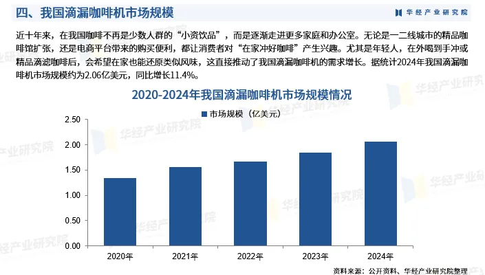 近十年来,在我国咖啡不再是少数人群的“小资饮品”,而是逐渐走进更多家庭和办公室。无论是一二线城市的精品咖啡馆扩张,还是电商平台带来的购买便利,都让消费者对“在家冲好咖啡”产生兴趣。尤其是年轻人,在外喝到手冲或精品滴滤咖啡后,会希望在家也能还原类似风味,这直接推动了我国滴漏咖啡机的需求增长。据统计2024年我国滴漏咖啡机市场规模约为2.06亿美元,同比增长11.4%。