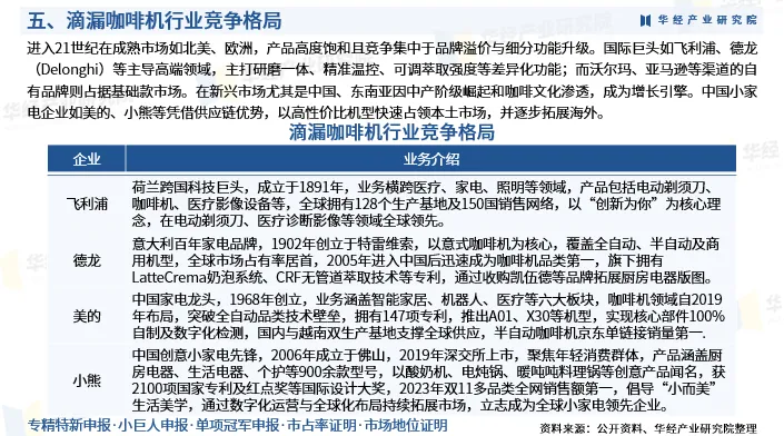 进入21世纪在成熟市场如北美、欧洲,产品高度饱和且竞争集中于品牌溢价与细分功能升级。国际巨头如飞利浦、德龙(Delonghi)等主导高端领域,主打研磨一体、精准温控、可调萃取强度等差异化功能;而沃尔玛、亚马逊等渠道的自有品牌则占据基础款市场。在新兴市场尤其是中国、东南亚因中产阶级崛起和咖啡文化渗透,成为增长引擎。中国小家电企业如美的、小熊等凭借供应链优势,以高性价比机型快速占领本土市场,并逐步拓展海外。