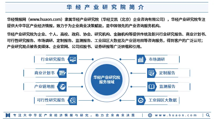 华经情报网隶属于华经产业研究院,专注大中华区产业经济情报及研究,目前主要提供的产品和服务包括传统及新兴行业研究、商业计划书、可行性研究、市场调研、专题报告、定制报告、工业园区大数据、产业链地图、专精特新申报及市场地位证明等。涵盖文化体育、物流旅游、健康养老、生物医药、能源化工、装备制造、汽车电子、农林牧渔等领域,还深入研究智慧城市、智慧生活、智慧制造、新能源、新材料、新消费、新金融、人工智能、“互联网+”等新兴领域。