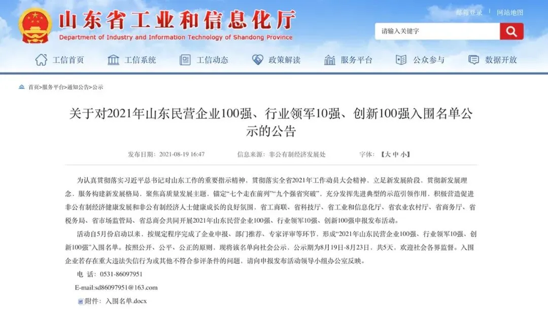 8月19日,山东省工信厅发布了《关于对2021年山东民营企业100强、行业领军10强、创新100强入围名单公示的公告》,山东京博控股集团有限公司、山东京博石油化工有限公司、山东京博中聚新材料有限公司、黄河三角洲京博化工研究院有限公司4家公司榜上有名。