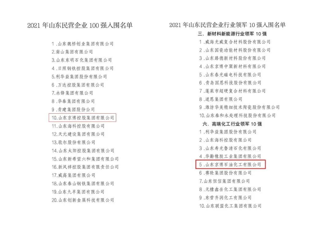 京博石化入围“2021年山东民营企业行业领军10强”,位居“高端化工行业领军10强”第5位。