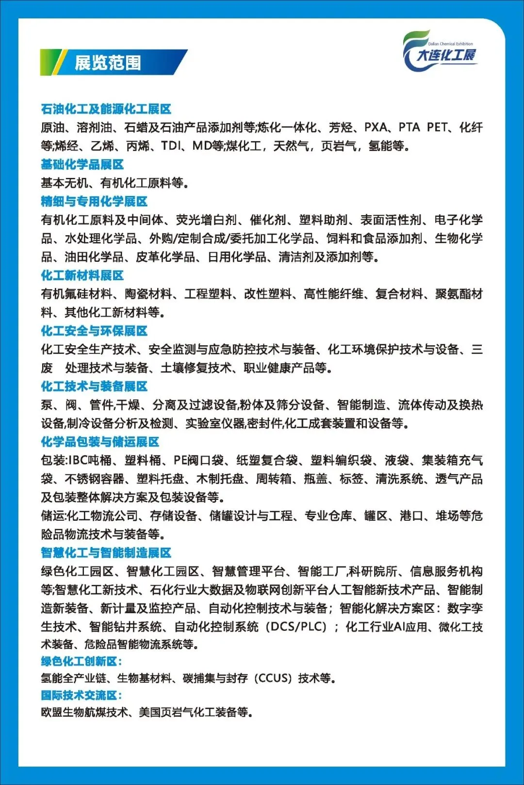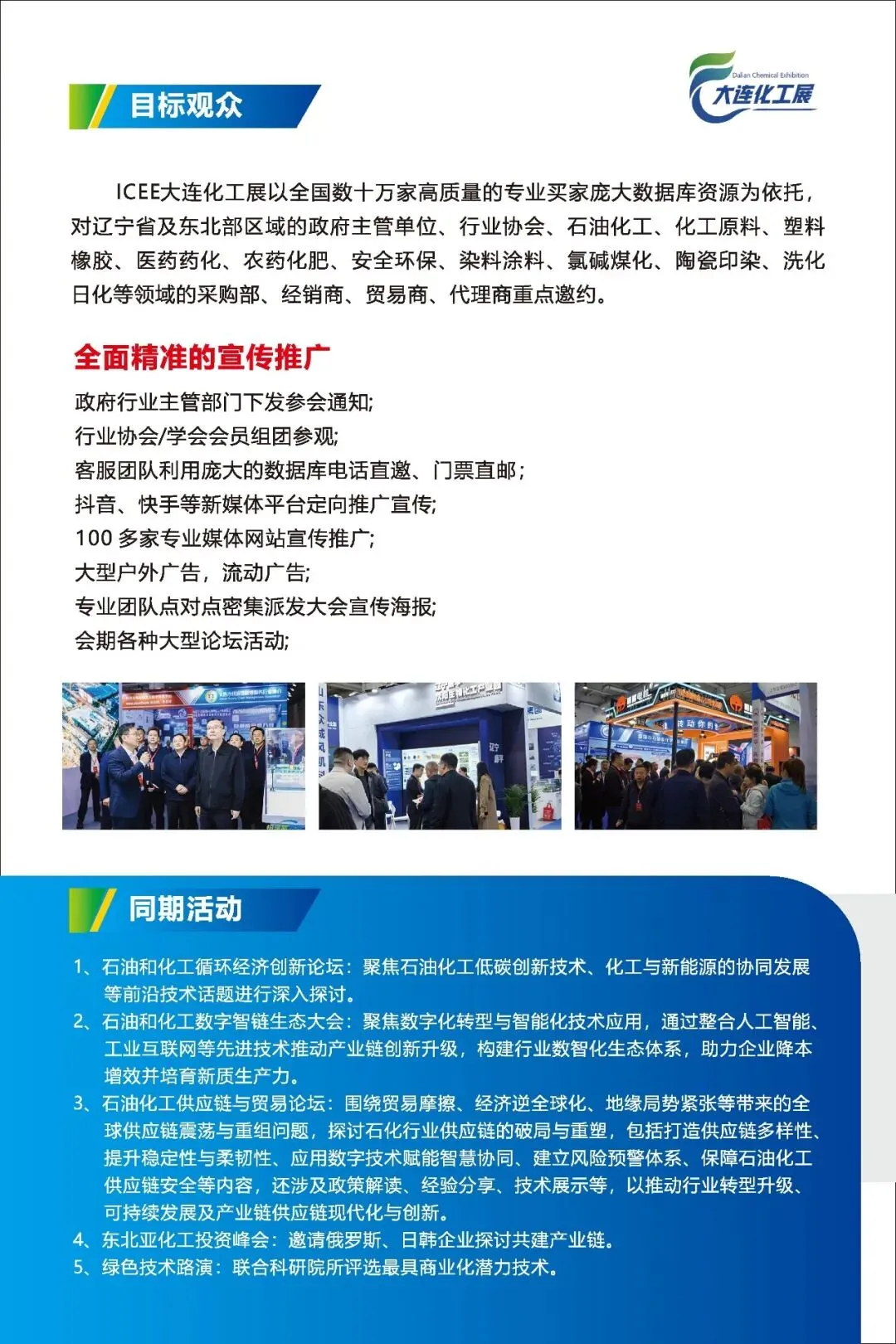 展览会以“智创绿色生态 共塑产业新局”为主题,发挥产业、区域和资源优势,通过展览、对接会、讲座等多种形式,汇聚辽宁省及东北部区政府单位、全国石化产业链企业、高质量专业买家、行业专家学者,集招商引资、促进贸易,品牌展示、产品交易、行业交流、投融资等功能于一体,是中国化工领域的重要宣传交流平台。