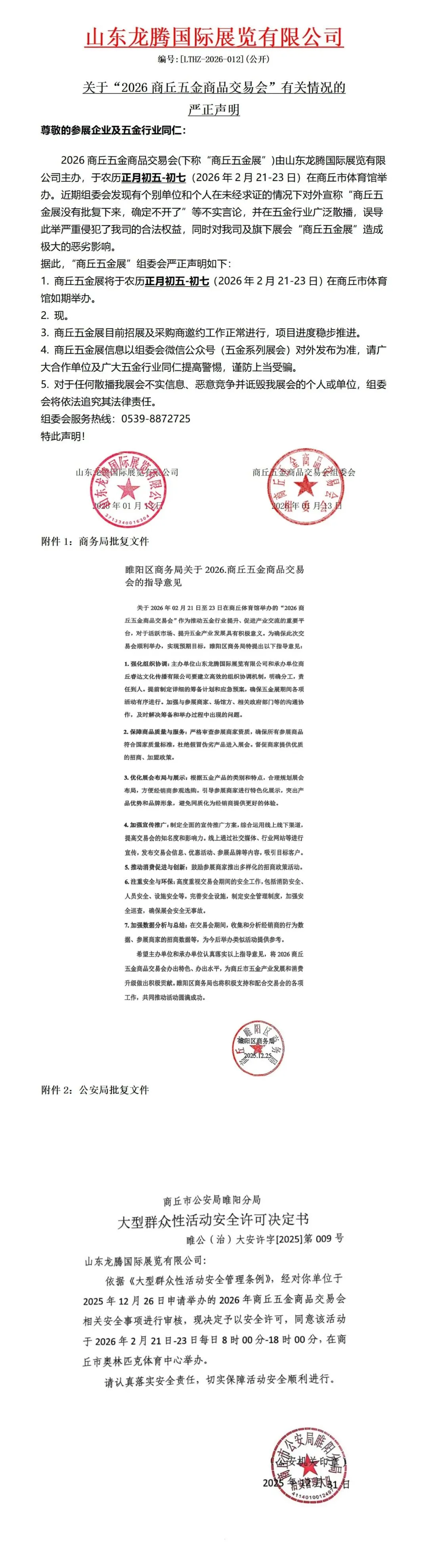 2026商丘五金商品交易会(下称“商丘五金展”)由山东龙腾国际展览有限公司主办,于农历正月初五-初七(2026年2月21-23日)在商丘市体育馆举办。近期组委会发现有个别单位和个人在未经求证的情况下对外宣称“商丘五金展没有批复下来,确定不开了”等不实言论,并在五金行业广泛散播,误导此举严重侵犯了我司的合法权益,同时对我司及旗下展会“商丘五金展”造成极大的恶劣影响。