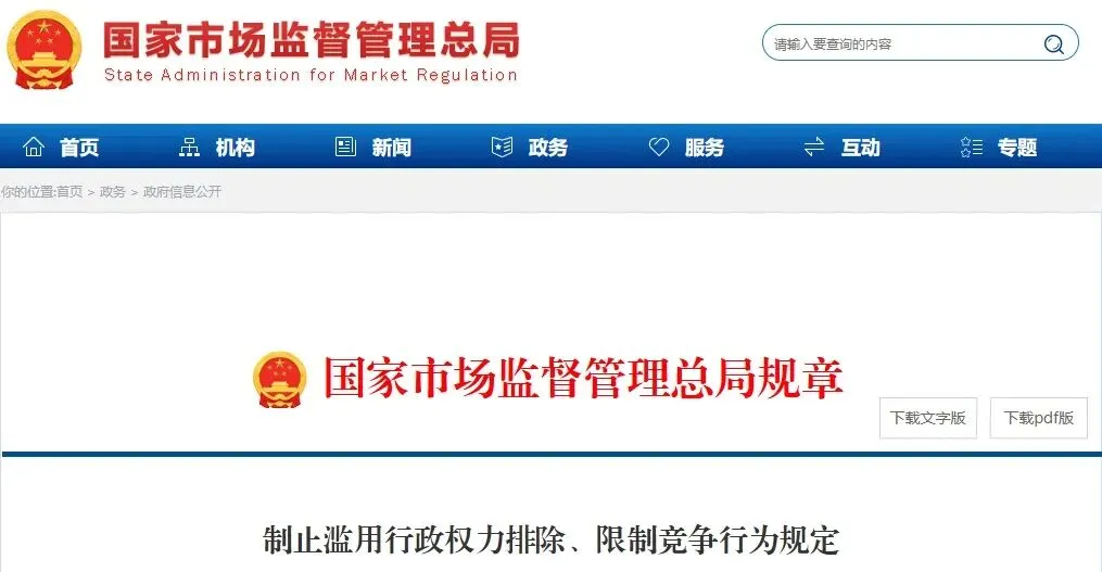 国家市场监督管理总局发布修订后的《制止滥用行政权力排除、限制竞争行为规定》,自2026年2月1日起施行。