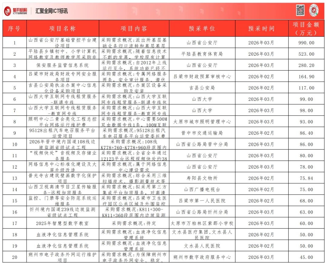 此次山西多地重点项目招标,既是区域高质量发展的重要布局,也是企业抢占细分赛道的黄金机遇。各项目招标时间明确,需求清晰,期待具备核心竞争力的合作伙伴踊跃参与,共筑山西数字化与智能化建设新格局。