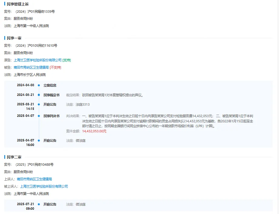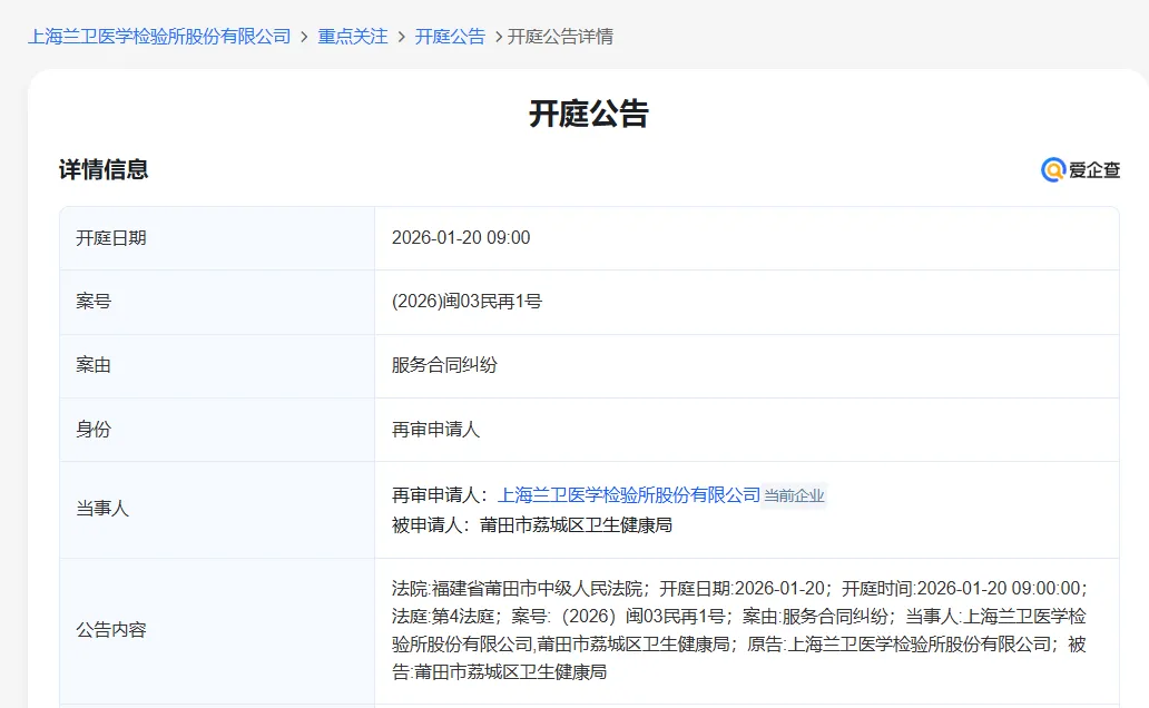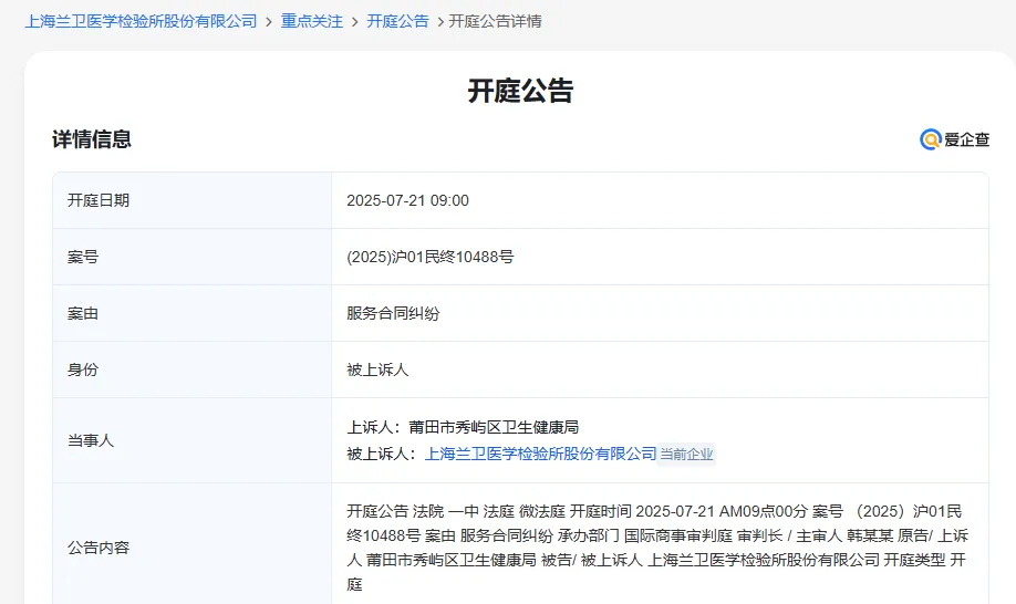 1月12日,爱企查披露了一则开庭信息:上海兰卫医学检验所股份有限公司以原告/上诉人身份,与莆田市荔城区卫生健康局发生服务合同纠纷。