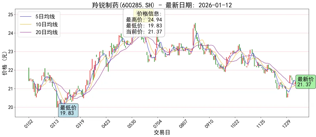 羚锐制药(600285.SH)截至2026年1月12日的走势呈现短期弱势下行、中期震荡调整的特征。从趋势看,5日、10日、20日均线均呈向下发散态势,当前价21.37元低于所有短期均线,显示短期处于明确的下跌通道;中期来看,股价自2025年8月创下24.94元阶段性高点后持续回落,20日均线逐步走平转跌,缺乏向上的趋势性动力。