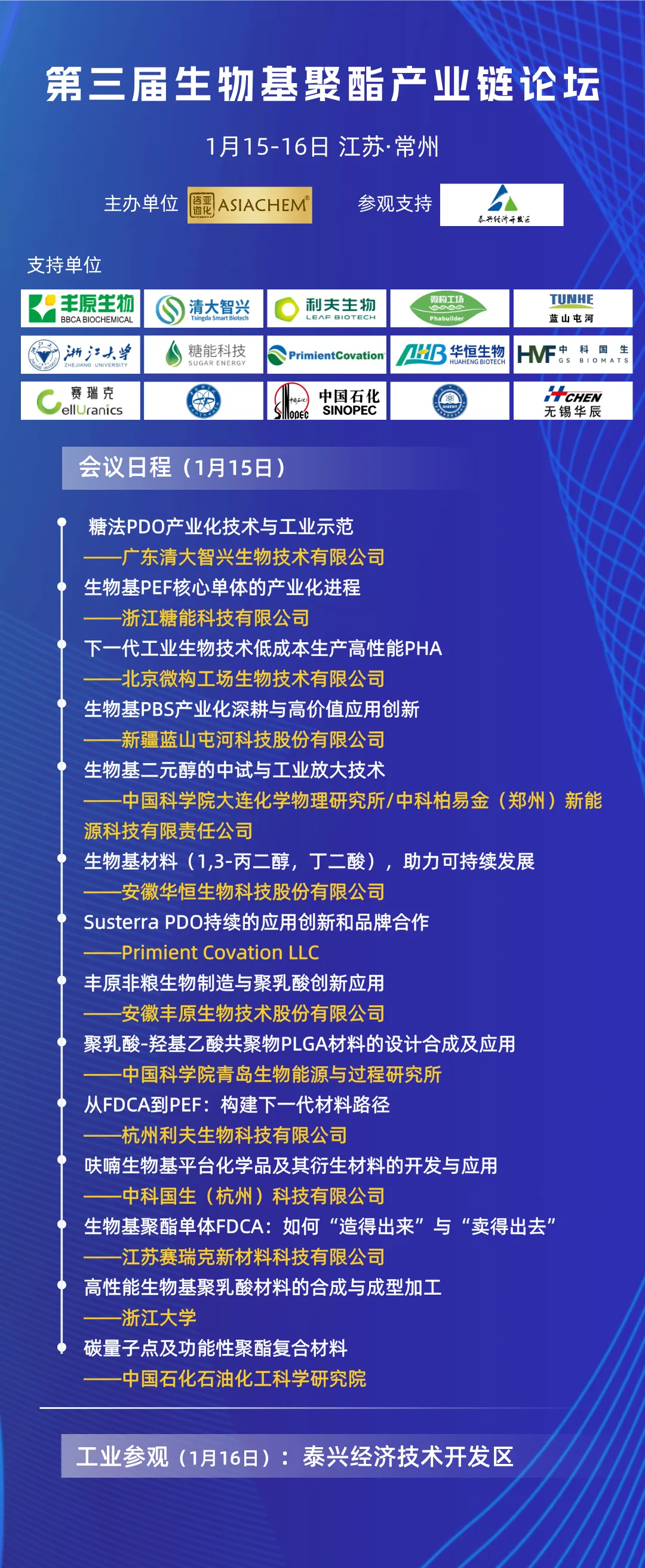 第三届生物基聚酯产业链论坛将于1月15-16日在常州召开,会议将组织参观泰兴经济开发区。清大智兴、糖能、微构工场、丰原、华恒、蓝山屯河、大化所、利夫、Covation、青岛能源所、赛瑞克、中科国生、浙大、石科院等将作主题演讲