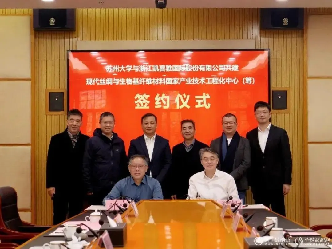 苏州大学与凯喜雅集团签署协议,共建现代丝绸与生物基纤维材料国家产业技术工程化中心。苏州大学副校长张正彪表示,此次合作是落实产学研融合、服务国家战略之举,期待双方协同创新,赋能丝绸产业。凯喜雅集团执行总裁刘光芒介绍,集团拥有全产业链优势,希望借助苏大科研力量推动产业升级。合作将整合双方资源,聚焦关键技术,加速成果转化,助力丝绸产业高端化、智能化、绿色化发展。