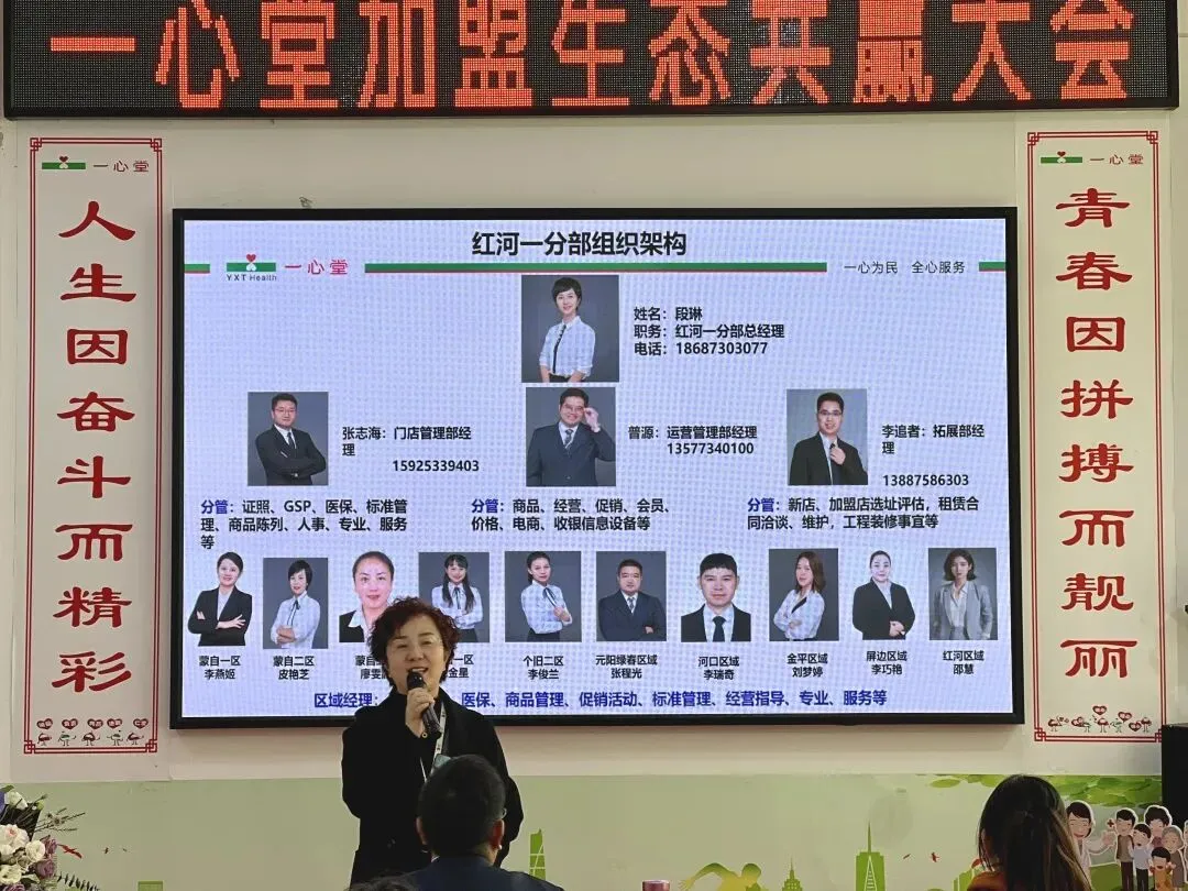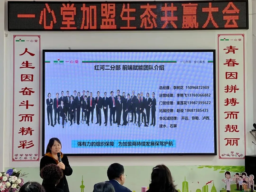 云南公司红河一分部总经理段琳、二分部副总经理李树花分别就区域市场布局、管理团队及支持体系作了详细介绍。拓展、运营、门管、区域经理等团队将从选址、装修、办证、商品、会员、营销活动、医保对接、标准化管理、专业服务等环节,为加盟商提供全方位、全周期赋能。段琳通过前期加盟门店开业视频展示了运营实绩,李树花则介绍了一心堂丰富的大健康品类与独家商品优势,为现场加盟商注入了强劲信心。