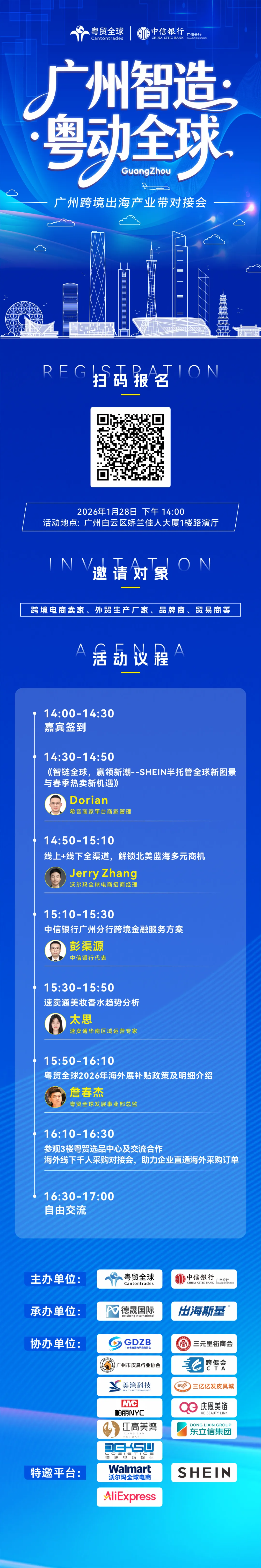 为此,1月28日,由广东粤贸全球科技有限公司主办的「广州智造·粤动全球」——广州跨境出海产业带对接会,集结SHEIN、沃尔玛、速卖通三大顶级平台及中信银行广州分行等全产业链资源,为“广州智造”扬帆出海量身打造全链路赋能盛宴!