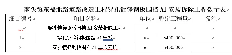 5、招标范围:本次对南头镇东福北路道路改造工程范围内的穿孔镀锌钢板围挡A1安装拆除工程进行招标,具体工程量如下: