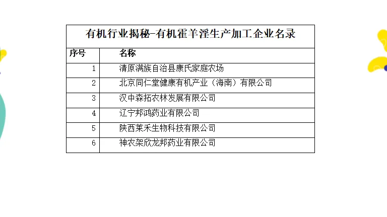 目前,经过中国有机认证的霍羊淫生产加工企业共有6家,具体如下: