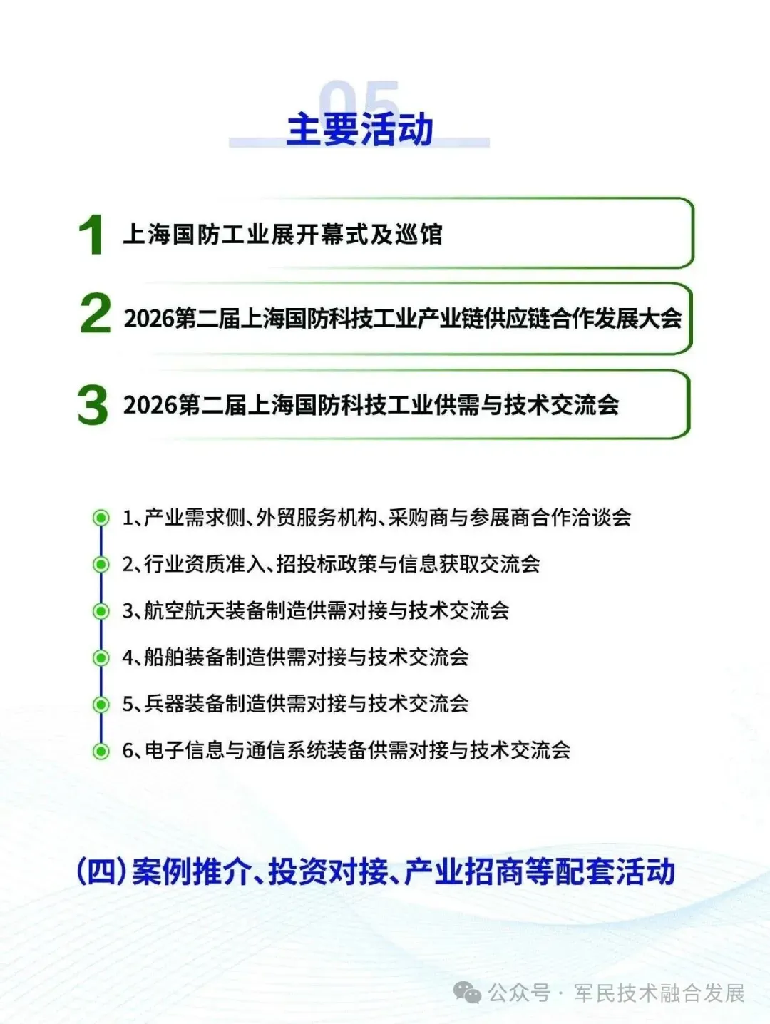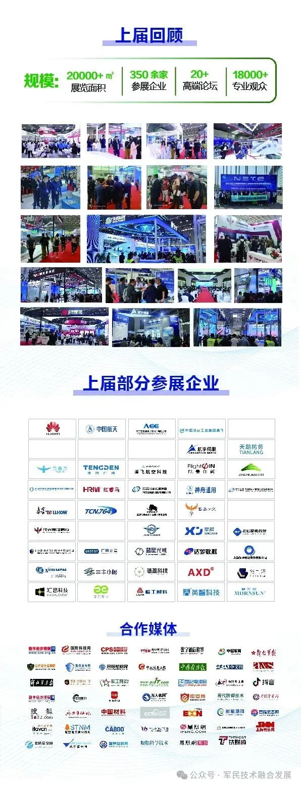 立足华东,辐射全球国防军工市场,聚焦运载火箭、发动机、特种电子元器件、半导体产业、精密陶瓷、微波射频、电磁兼容、武器装备智能化、雷达系统、特种计算机、激光及光电子、军工自动化、工业机器人、动力传动、智能制造、军民两用新材料及制品、军工复合材料、军工装备配套产品、精密加工、增材制造和3D打印、军工装备试验、惯性导航、传感器、仪器仪表、国产化信创产业、网络安全、军事通信系统、通信保密、指挥控制、数据中心、电池电源、后勤装备、应急救援装备、特种车辆、方舱、光电系统、无人机整机、反无人机装备、特种机器人、训练器材、野营装具、卫勤医疗、油料装备、炊事装备、防弹装备、单兵装备、物流装备、综合保障装备等前沿技术装备。