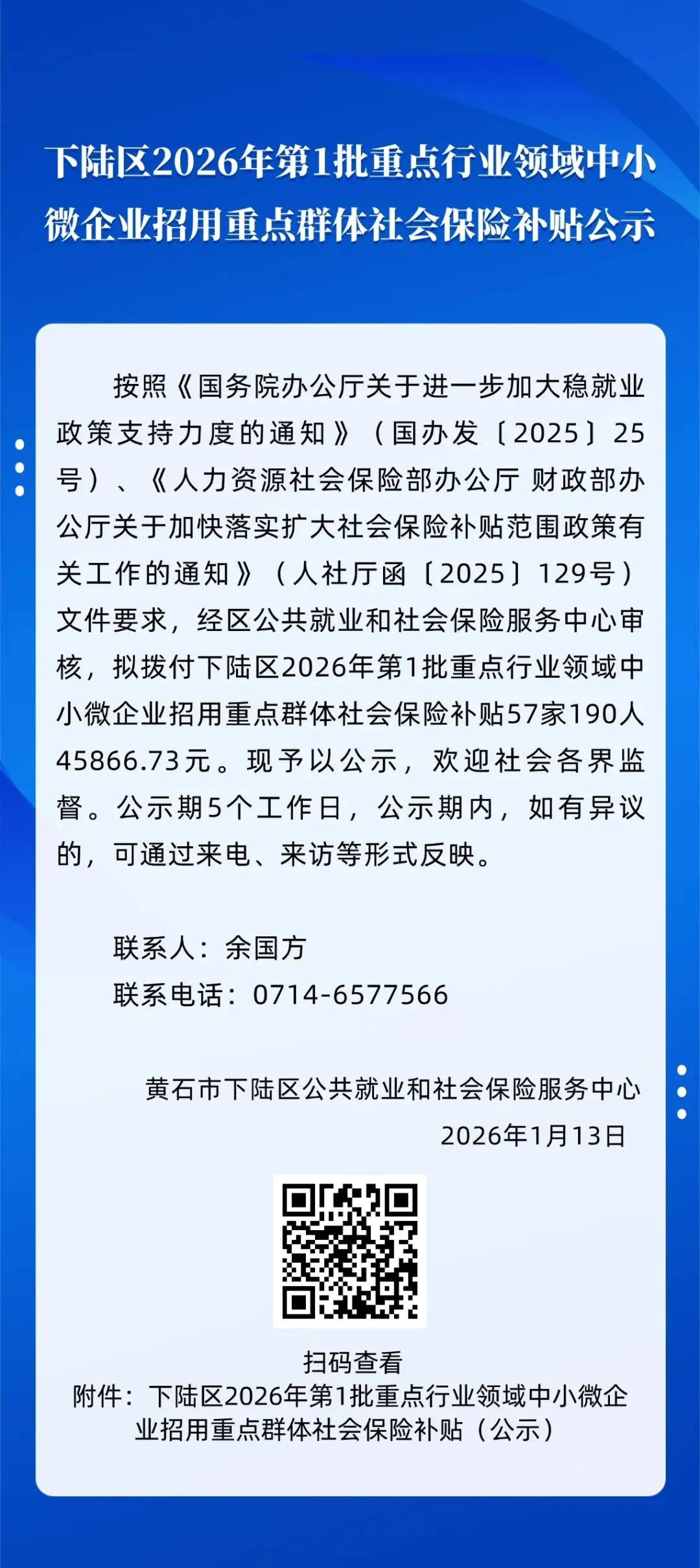 下陆区2026年第1批重点行业领域中小微企业招用重点群体社会保险补贴公示