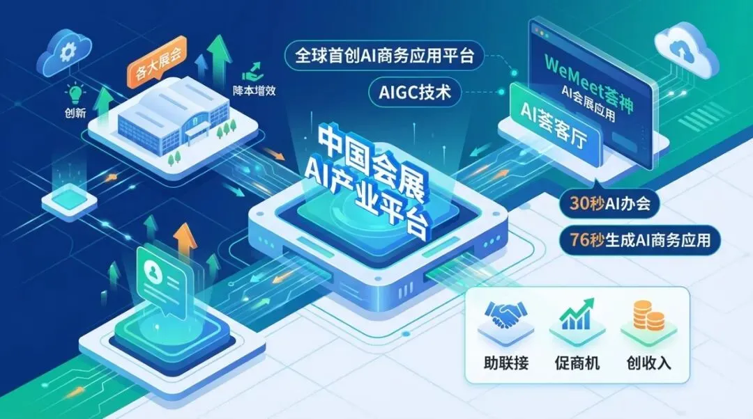 作为全球首个AI商务应用平台,该系统以"连接生态、激活商机、创造价值"为发展使命,依托AIGC技术底座,实现两大核心突破:支持30秒完成AI会议全流程搭建,76秒生成定制化AI商务应用场景。这种技术革新使AI应用开发成本降低60%以上,项目交付周期缩短75%,同时显著提升参会者体验、运营效率及投资回报率。