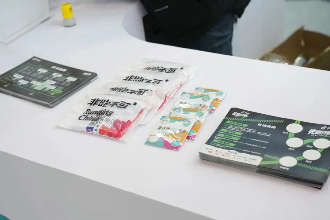 数字心动还为跑者们准备了诚意满满的互动福利。袖套、专业跑步袜、实用腰包、定制帽子、纪念书签、号码牌钉扣等精美小礼品整齐陈列,只需在展台扫码,将自己的马拉松PB成绩投屏展示并拍照打卡,就能免费领取一份专属礼遇。