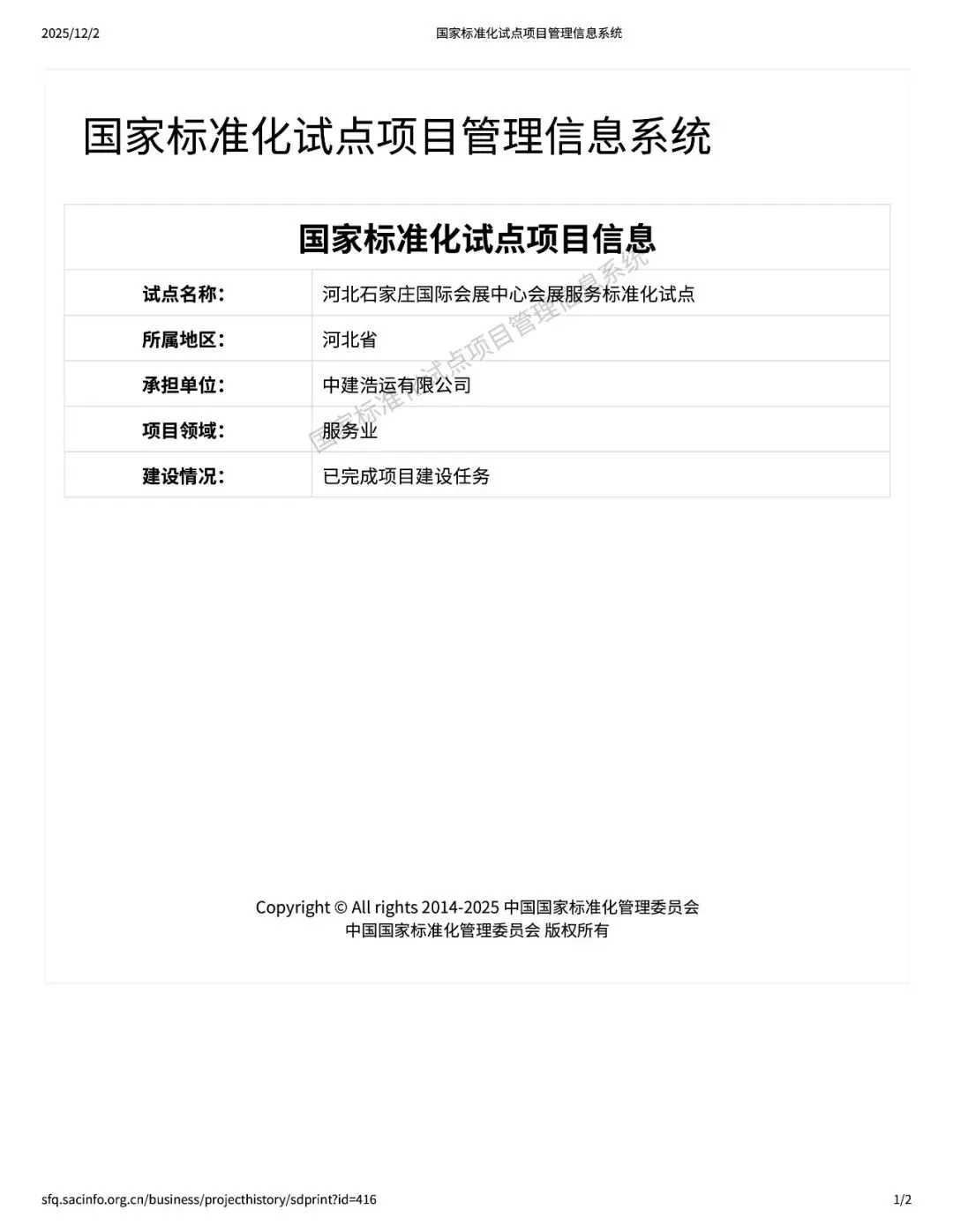 近日,国家标准化管理委员会管理信息系统公示,中建浩运有限公司承担的“河北石家庄国际会展中心会展服务标准化试点”已圆满完成项目建设任务。这标志着石家庄国际会展中心历经两年多的试点攻坚,顺利通过全部验收,正式跻身会展服务标准化建设的标杆行列。