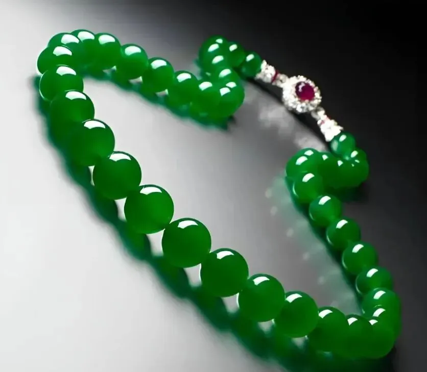 还有一串项链更夸张,每一颗珠子都饱满通透,绿得整整齐齐。后来查了下资料,这串在保利拍卖行卖出去的时候,成交价破亿了。你说一串石头珠子,能值一套顶级豪宅,这事儿放以前我打死都不信。