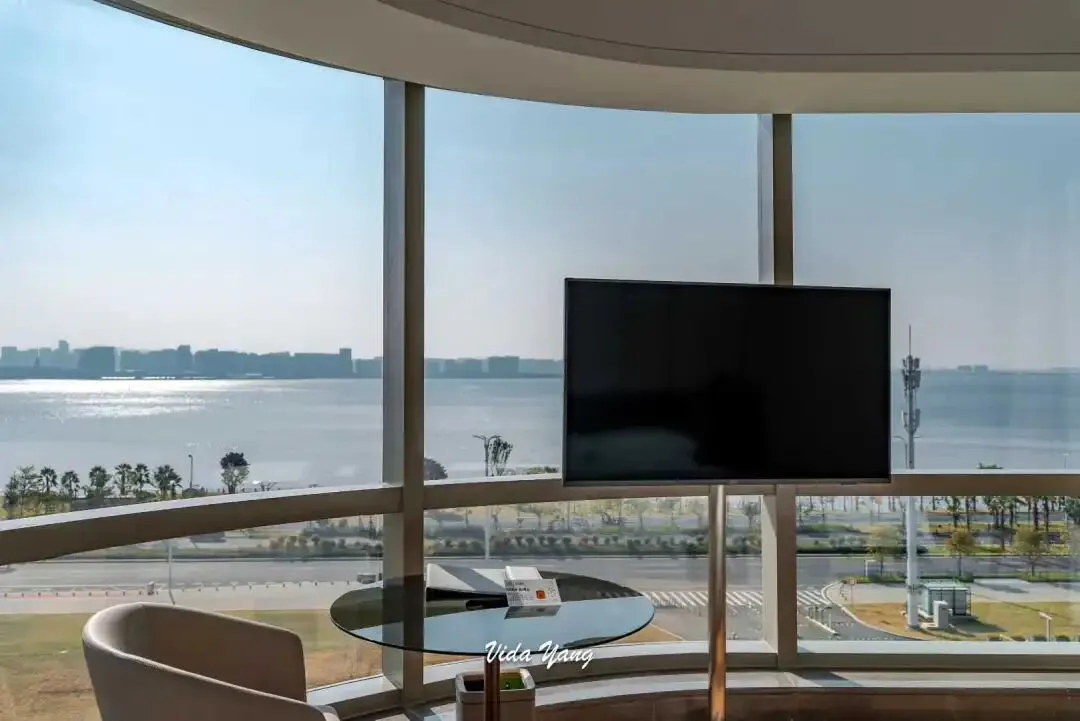具体位置上,酒店位于翔安区鸿江道的核心路段,外形设计成“一主两从”的“白鹭展翅”造型,已经成了滨海边的新地标,地理优势堪称黄金枢纽:走路5分钟就能到厦门国际博览中心,10分钟到厦门奥林匹克体育中心,闲逛几步就到荻花洲海滩和彩虹跑道,