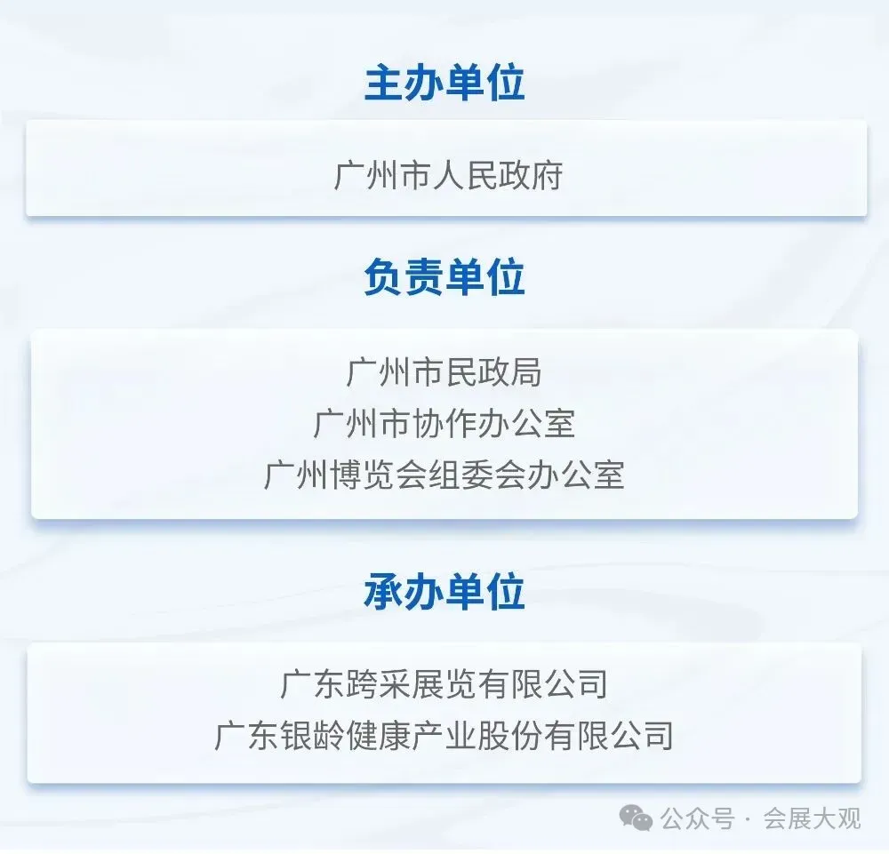 第十届广州老博会由广州市人民政府主办,广州市民政局、广州市协作办、广州博览会组委会办公室具体负责,广东跨采展览有限公司、广东银龄健康产业股份有限公司承办,联动20+行业商协会,将邀约全国各省市民政部门、国际城市团组参展参会,展会规格与政策资源全国领先。