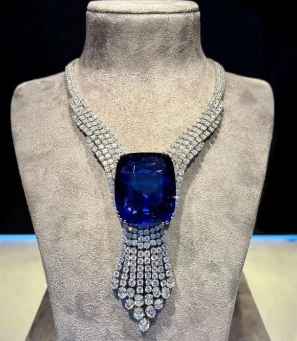 蓝美人宝石项链在全球拍卖史上挺有名气。中间那颗主石大得离谱,感觉和泰坦尼克号里那个差不多尺寸了。整条链子镶满了各种大小的钻石,看着就华丽得不行。