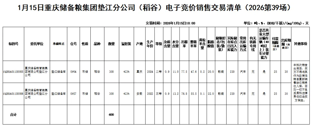 受重庆储备粮管理集团有限公司垫江分公司委托,重庆市粮油批发市场有限责任公司(即国家粮食重庆交易中心,以下简称“批发市场公司”),定于2026年1月15日10:00举办重庆储备粮集团垫江分公司(稻谷)电子竞价销售交易会,现将有关事项公告如下: