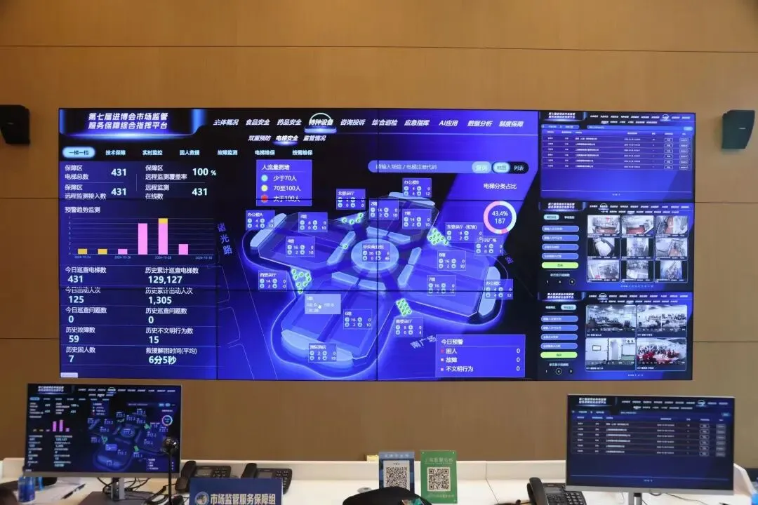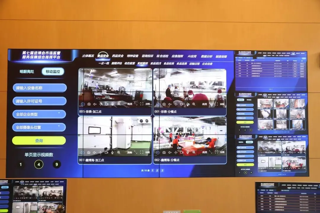 为消除“擅自改变流程布局和设施设备”这一食品安全重要隐患,本次进博会采用360°全景拍摄方法,将展馆内餐饮单位流程布局、设施设备进行锁定,通过立体化场景比对,“沉浸式”智慧监管再升级,更直观地监控餐饮单位动态,哪怕一个冰箱、一台洗碗机的位置变动都能立刻发现。今年共计增加10个移动监控探头,分别对场内数家集中供餐单位及新闻中心临时供餐点位进行了移动监控设备安装,可360°翻转查看点位上的各方位情况,发现问题及时开展应急指挥调度。同时,升级扩容食品安全快检室,对食品及原料供应商加强食品检测,检测数据每日汇总进行大屏端展示,并对重点产品开展食品安全风险监测,实现食品安全快速预警、有效监管。