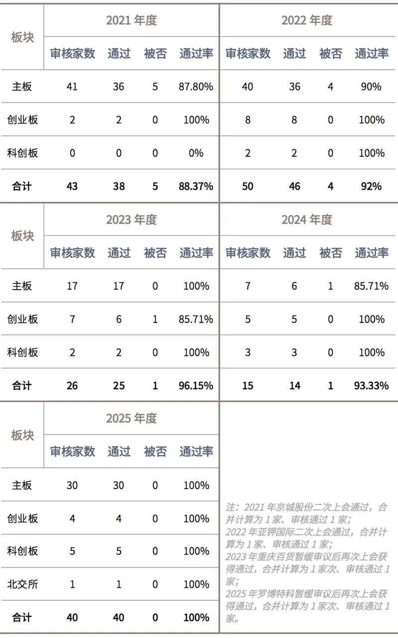 2025年全年,A股全板块共审核上市公司资产重组40家次,审核通过40家,整体过会率100%。其中,深交所并购重组委员会共召开会议17次,审核上市公司资产重组16家次(罗博特科暂缓审议后通过,算1家次),审核通过16家,整体过会率100%;上交所并购重组委员会共召开会议23次,审核上市公司资产重组23家次,审核通过23家,整体过会率100%;北交所并购重组委员会共召开会议1次,审核上市公司资产重组1家次,审核通过1家,整体过会率100%。