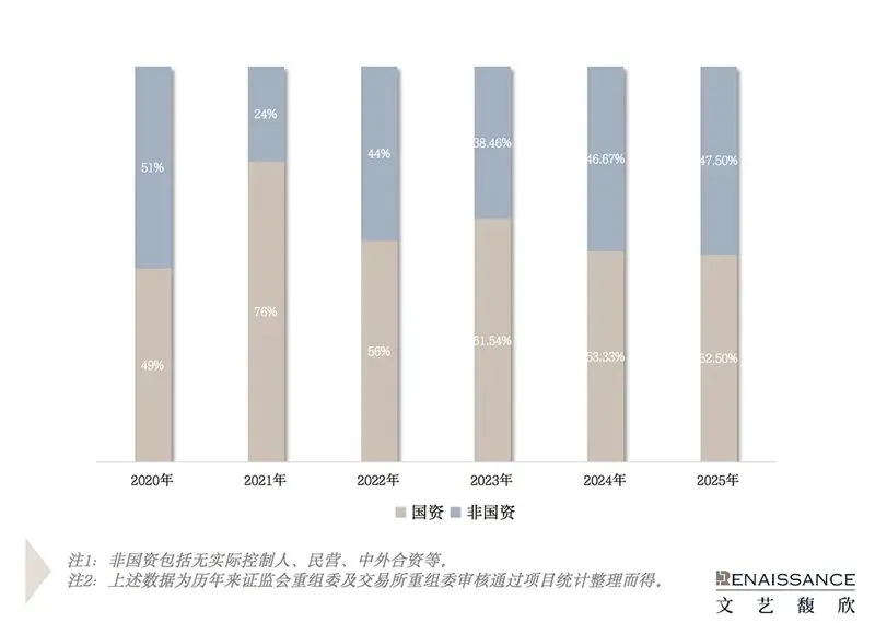 2025年,在所有40家审核的上市公司重组项目中,国资背景上市公司21家,占比52.50%;非国资上市公司19家,占比47.50%,整体上平分秋色。近年来,A股上市公司许可类并购重组按照实控人属性分类的具体情况如下: