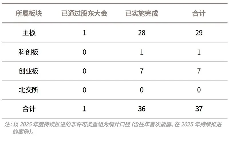 2025年全年,A股全板块已通过股东大会及资产交割实施完成的案例共计37家次,分板块情况如下: