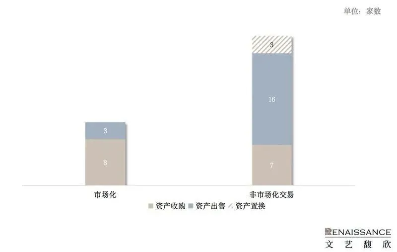 资产出售和资产置换都以非市场化交易为主(交易对手方大多为关联方),是上市公司调整战略和业务布局或者剥离业绩不佳的资产的主要方式;资产收购则更随机,取决于上市公司看中的优质资产是来自于内部还是外部。
