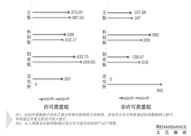 2025年,许可类重组审核过会40家次;非许可类重组已成功实施完成的36家次(不包括已通过股东大会未完成资产交割案例)。对比分析其项目周期情况如下:
