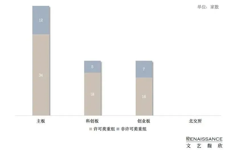 具体从上市公司发起交易时市值对比看,许可类重组交易的上市公司市值分布要高于非许可类重组交易。