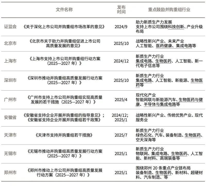 此后,北京、上海、广州、深圳、安徽、天津、郑州、无锡等8省市均陆续发布与并购重组直接相关的鼓励政策,半导体、生物医药等新质生产力行业为各地重点鼓励并购行业。