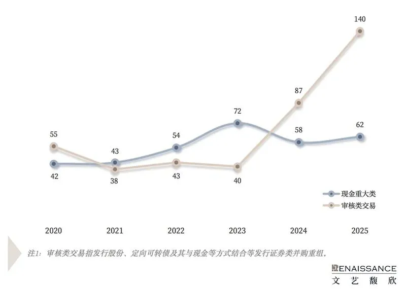 2025年A股市场首次公告重大及发股类资产重组202起,较2024年上升约40%,A股并购市场整体保持高度活跃状态。