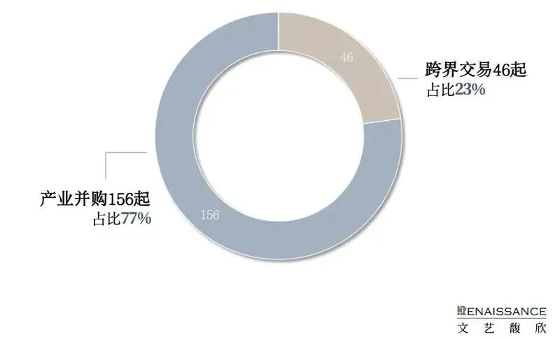 在2025年新公告交易中,产业并购156起,占比77%,为市场主要并购逻辑;跨界交易46起,占比23%。