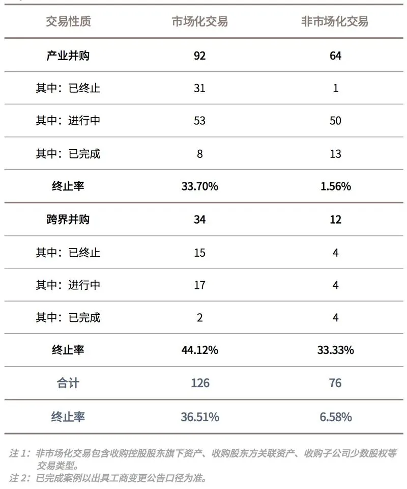 从终止率看,市场化交易(36.51%)显著高于非市场化交易(6.58%);跨界并购(41.30%)显著高于产业并购(20.51%);再进一步,市场化的跨界并购(44.12%)是终止率最高的一种交易类型,非市场化的产业并购(1.56%)是终止率最低的一种交易类型。