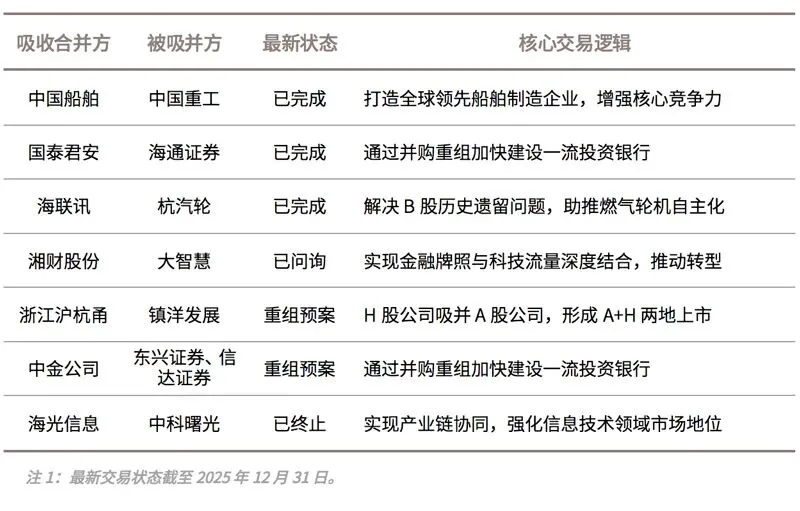 2025年,A股上市公司间吸收合并逐步提速,国泰君安吸并海通证券、中国船舶吸并中国重工交易完成,交易规模均达数千亿元。新公告吸并案例有湘财股份吸并大智慧(民营上市公司间吸收合并)、中金公司一次性吸并东兴证券、信达证券两家上市公司、浙江沪杭甬(H股)吸收合并镇洋发展(A股)等。