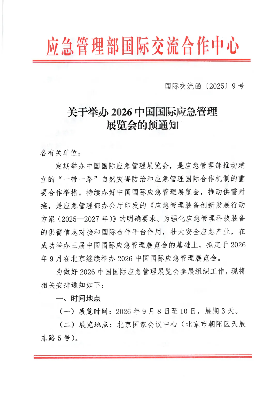 为强化应急管理科技装备的供需信息对接和国际合作平台作用,壮大安全应急产业,在成功举办三届中国国际应急管理展览会的基础上,2026中国国际应急管理展览会(简称2026中国应急展)将于2026年9月8-10日在北京国家会议中心举办。
