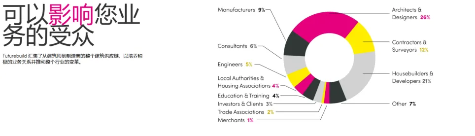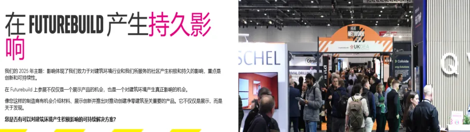 Ecobuild London(futurebuild以前称为Ecobuild)是欧洲最大的可持续建筑设计、结构和环境展览会。成立于2005年。参展商代表了新建筑、住宅和商业项目的全系列可持续建筑产品。业内最杰出的公司继续选择“重建未来”作为其最重要的营销平台,寻找和突出可持续建筑的持续机会,牢牢定位于建筑行业的中心。关注关键市场--建筑材料、住房、基础设施和技术仍然是可持续发展的核心。伦敦绿色建材展Futurebuild旨在促进行业主要制造商、分销商和专业买家提供一个交流最新行业信息、共同探讨最新市场趋势的国际平台。期间将举办多场行业研讨会,参展商将有机会与目标市场的行业决策者进行面对面的交流和治谈,开发和积累更多的客户资源,迎接新的市场机遇。节能环保在英国已经成为一种政治时尚,各党派都在推广自己的节能主张,以占据道德制高点,赢得更多选民。英国政府的推动和社会的高度环保意识,给英国节能环保建筑市场带来了巨大的商机。伦敦绿色建材展Futurebuild是中国绿色建材企业进入欧盟国家的最佳选择。
