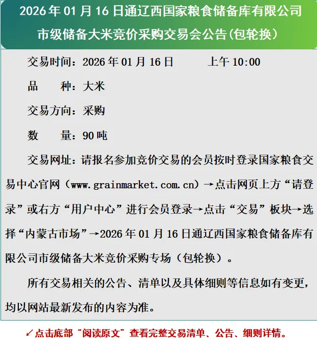 2026年01月16日通辽西国家粮食储备库有限公司市级储备大米竞价采购交易会公告(包轮换)