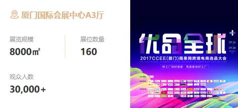 雨果跨境每年举办CCEE展会至少3-5场,分别在深圳、广州、厦门、杭州、南通、福州等城市举行,每场活动规模2万㎡~8万㎡,参展品牌500家~3000家,参展观众2万人~10万人,30+全球主流平台,100+跨境服务商,覆盖100+产业带,从选品、平台到服务涉及跨境电商全产业链。展会旨在搭建卖家与工厂的中间桥梁,为其提供一站式跨境柔性供应。