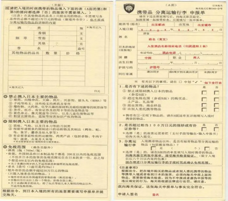 飞机上需要填写“入境纪录卡”和“携带行李申报单” ,请提前准备好酒店名称地址电话相关信息